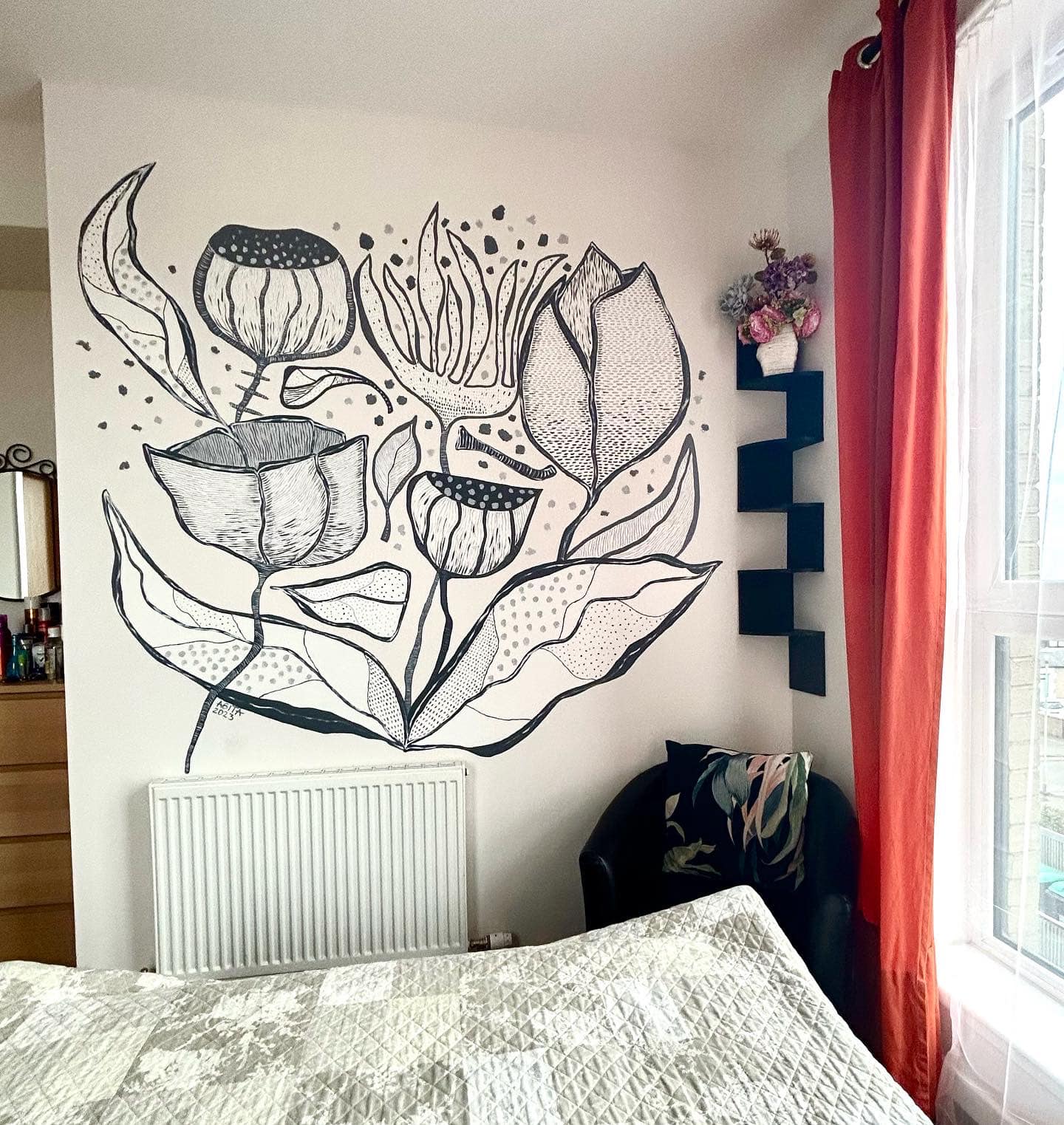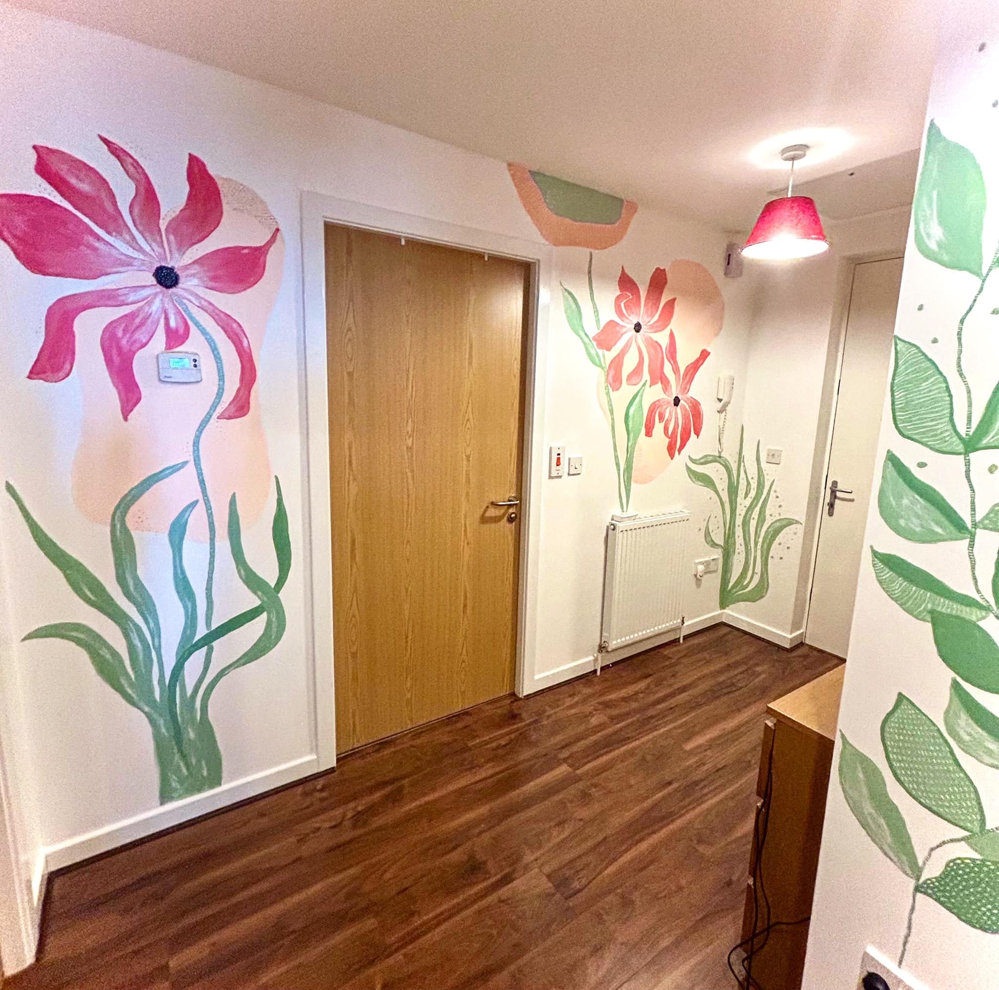 Murals transform spaces in ways that framed art simply can't. I approach walls the same way I approach canvas—intuitively, with colour, movement, and a sense of play. Whether it's bold abstract florals for a home, expressive faces for a creative studio, or custom designs tailored to your vision, I paint murals that shift the energy of a room and make it feel alive.